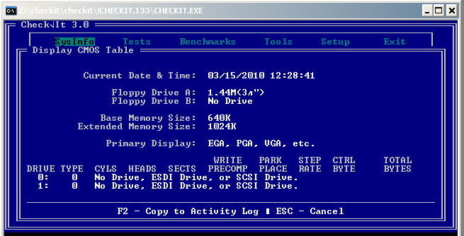 В панели "Display CMOS Table" отображается текущее значение даты и времени, считанное из CMOS-памяти, тип накопителей на гибких дисках, объем основной и расширенной памяти, тип видеоадаптера, а также тип накопителей на жестких магнитных дисках, подключенных к компьютеру.