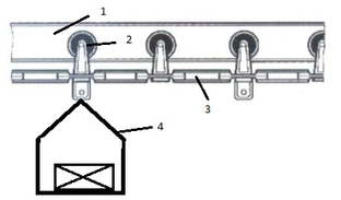 Грузонесущие подвесные конвейеры имеют направляющий путь «1», по которому движутся каретки «2», поддерживающие тяговую цепь «3» и несущие подвески с грузами «4».