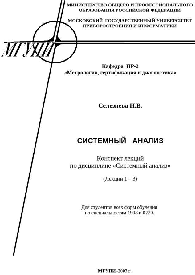 Конспект лекций предназначен для студентов третьего курса всех форм обучения специальностям 0720 «Стандартизация и сертификация» и 1908 «Метрология и метрологическое обеспечение» и является учебным пособием для углубленного изучения теоретического материала по дисциплине «Системный анализ».