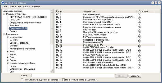 Аппаратные прерывания. К аппаратным прерываниям относятся как логические прерывания процессора и сопроцессора, возникающие при особой ситуации, например, делении на ноль, так и прерывания от контроллера прерываний, который обслуживает 15-16 линий для внешних устройств, таких как последовательные, и параллельные порты, клавиатуры, гибкие и жесткие диски и т.д. В первых компьютерах имелось восемь линий, затем они были расширены до 15 путем объединения 8 новых каналов в один. Этот канал может не только обрабатывать линий, но и работать самостоятельно. Поэтому компьютер может обслуживать от 15 до 16 линий. Девять линий находятся на шине ввода/вывода, оставшиеся линии предназначены для внешних устройств, например, клавиатуры, таймера и пр.