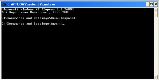 переключимся на второе окно командной строки. Введем mspaint для запуска Microsoft Paint