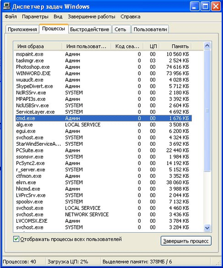поставим галочку Отображать процессы всех пользователей, щелкнем процесс cmd.exe