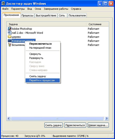 щелкнем правой кнопкой мыши задачу Command Promt (командная строка) и выберем Go To Process (перейти к процессам)
