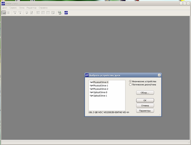 В данном окне можно выбрать один из имеющихся на компьютере дисков физических или логических. Выбор между физическим и логическим дисками осуществляется путем установки напротив соответствующей позиции метки в правой стороне окна «Выбрать устройство/диск».