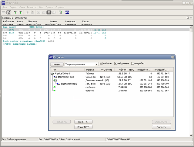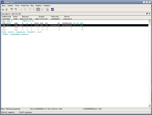 Открывшаяся в новом окне таблица разбиения диска содержит следующую информацию: количество строк, имеющих ненулевые значения, в ней отражается количество существующих разделов (в данном случае их два), правый столбик указывает на размеры данных разделов. Поле «Число секторов» указывает число секторов диска, отведенных под раздел (занимает в поле записи 4 байта).
