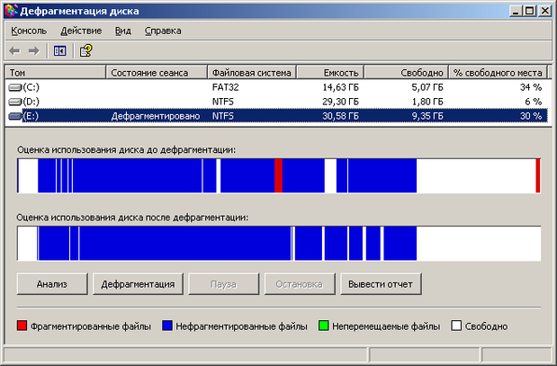 Из отчетов видно, что после дефрагментации диска Е: фрагментированных файлов не осталось. Произошла полная дефрагментация диска.