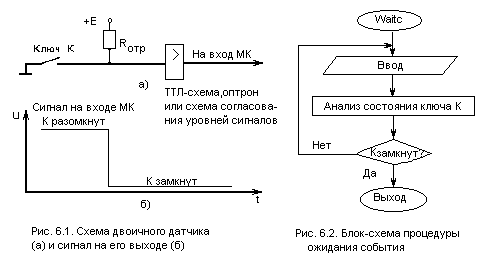 Ожидание статического сигнала. Типовая процедура ожидания события (WAIT) состоит из следующих действий: ввода сигнала от датчика, анализа значения сигнала и передачи управления в зависимости от состояния датчика. На рис. 6.2 представлена блок-схема алгоритма процедуры ожидания события, фиксируемого замыканием контакта двоичного датчика. Конкретная программная реализации процедуры зависит не только от типа МК, но и от того, каким образом датчик подключен к МК. Он может быть подключен к одной из линий портов МК или к специальным тестируемым входам (Т0, Т1 для МК48).