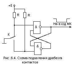 При работе МК с датчиками, имеющими механические или электромеханические контакты (кнопки, клавиши, реле и клавиатуры), возникает явление, называемое дребезгом. Это явление заключается в том, что при замыкании контактов возможно появление отскока (BOUNCE) контактов, которое приводит к переходному процессу. При этом сигнал с контакта может быть прочитан МК как случайная последовательность нулей и единиц.Подавить это нежелательное явление можно схемотехническими средствами с использованием буферного триггера (рис. 6.4), но чаще это делается программным путем.