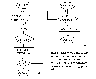 Рис.6.5. Блок-схемы процедур подавления дребезга контактов путем многократного считывания (а) и с использованием временной задержки (б)
