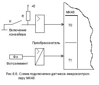 Подсчет числа импульсов между двумя событиями. Эту типовую процедуру удобно проиллюстрировать на конкретном примере. Предположим, что необходимо подсчитать число деталей, сошедших с конвейера от момента его включения до момента выключения. Факт схода детали с конвейера фиксируется фотоэлементом, на выходе которого формируется импульсный сигнал (рис. 6.6) .