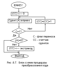 Программное преобразование унитарного кода, принятого от клавиатуры, в двоичный может быть выполнено методом сдвигов исходного унитарного кода и подсчетом числа сдвигов на счетчике до появления первого переноса. Схема алгоритма такой процедуры приведена на рис. 6.7.