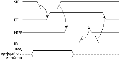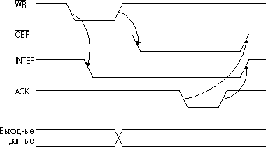 Высокий уровень на этом выходе может быть использован для прерывания выполнения основной программы процессора в момент принятия данных периферийным устройством. Сигнал INTR устанавливается в лог. 1 по переднему фронту сигнала /ACK (если одновременно сигналы /OBF и INTE установлены в лог. 1) и сбрасывается по заднему фронту сигнала на входе /WR микросхемы.
