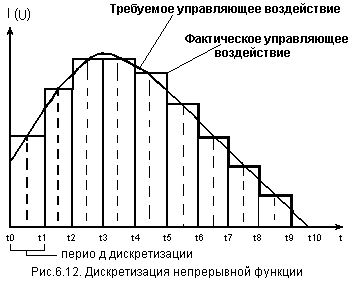 Некоторые объекты управления могут требовать непрерывного управляющего воздействия сложной формы. Для реализации такого воздействия в МК используются цифровые методы интегрирования: на каждом интервале времени dt непрерывная функция изменяется ее средним дискретным значением. Таким образом, управляющее воздействие становится ступенчатым (рис.6.12) и программа его формирования может быть реализована с использованием процедур выдачи кода и временной задержки заданной длительности.