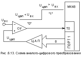 На выходе компаратора формируется сигнал 0, если Uцап<Uвх, и сигнал 1, если Uцап>Uвх. Микроконтроллер через порт Р1, работающий в режиме вывода, передает двоичные коды в ЦАП, выход которого подсоединяется к входу "плюс" компаратора. Выход компаратора (двоичный сигнал) заводится на вход тестирования T0.