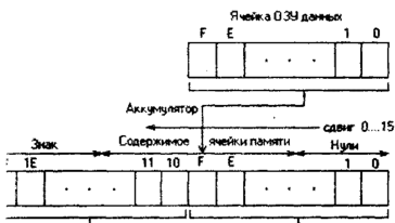 Операнд выбирается из ОЗУ данных и оперирует с содержимым аккумулятора. В командах данной подгруппы сдвиг может принимать значение от 0 до 15. Сдвиг равный