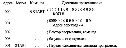 Рассмотрим пример кодирования команды безусловного перехода в START. В -мнемоника команды безусловного перехода, START - метка команды, к которой осуществляется переход. Сама команда занимает 2-е ячейки ПЗУ программ с адресами 0 и 1. Команда с меткой START находится в ПЗУ программ по адресу 4. Это стандартное начало выполнения программы. Дело в том, что как указывалось ранее, при возникновении прерывания, в программный счетчик принудительно записывается константа 002, а программист по этому адресу помещает команду безусловного перехода на программу обработки прерывания. Т.е. первая команда программы должна обходить ячейки с адресами 2 и 3, что и делает команда В START.
