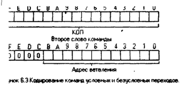 Команды условных и безусловных переходов кодируются в памяти программ 2-мя 16 разрядными словами. При этом первое слово команды является КОП, в 12 младших разрядах второго слова указывается адрес команды, к которой осуществляется переход. Старшие 4 разряда второго слова команды устанавливаются в 0 (рис.6.3).