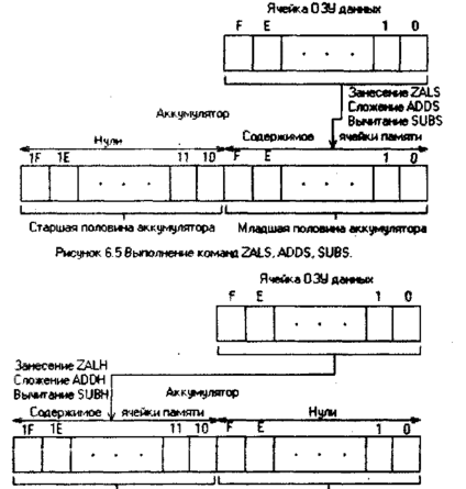 Операнд выбирается из ОЗУ данных и оперирует с содержимым аккумулятора. Допускается прямая и косвенная адресация. Операнд либо сдвигается на 16 разрядов, т.е. оперирует со старшей половиной аккумулятора, либо вообще не сдвигается. В последнем случае, в отличие от команд LAC, ADD, SUB, размножения знака не происходит (старшие разряды дополняются нулями), т.е. операнд рассматривается как 16-ти разрядное положительное число без знака. К этой подгруппе относятся команды загрузки аккумулятора ZALH, ZALS, команды сложения ADDH, ADDS, команды вычитания SUBH, SUBS. Команды, оканчивающиеся на буку Н оперируют со старшей половиной аккумулятора, на букву S - с младшей половиной аккумулятора. На рис.6.5, 6.6 показан принцип выполнения таких команд.
