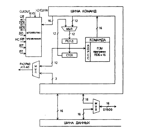 Что находится на адресной шине - адрес ячейки ПЗУ программ или номер внешнего порта, определяется внешними сигналами, вырабатываемыми контроллером (сигналы сопровождения). При написании программы номер порта помещается в определенные разряды команды, а мультиплексор адресной шины коммутирует на внешнюю адресную шину либо содержимое программного счетчика, либо определенные разряды внутренней шины команд, по которой передается 3-х разрядный адрес внешнего порта. Мультиплексор программного счетчика. Этот мультиплексор определяет, откуда записывается информация в программный счетчик - с шины команд (при выполнении условных и безусловных переходов, поскольку адрес перехода находится в команде), либо из верхнего уровня стека (при выполнении возврата из подпрограмм). Мультиплексор внешней шины данных. Данный мультиплексор может быть отнесен как к блоку управления, так и к операционному блоку. Его назначение заключается в коммутации внешней шестнадцатиразрядной шины данных или на внутреннюю шину команд или на внутреннюю шину данных. По внешней шине данных принимается последовательность команд из ПЗУ программ, а также данные из внешних портов и ПЗУ программ, кроме того, микропроцессор может выставлять на внешнюю шину информацию, которая записывается либо во внешнее ОЗУ, либо во внешние порты. При приеме из внешнего ПЗУ команды мультиплексор передает ее на внутреннюю шину команд. В остальных случаях внешняя шина данных соединяется с внутренней шиной данных.