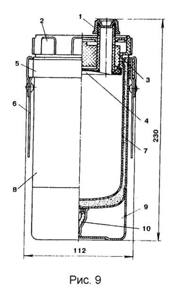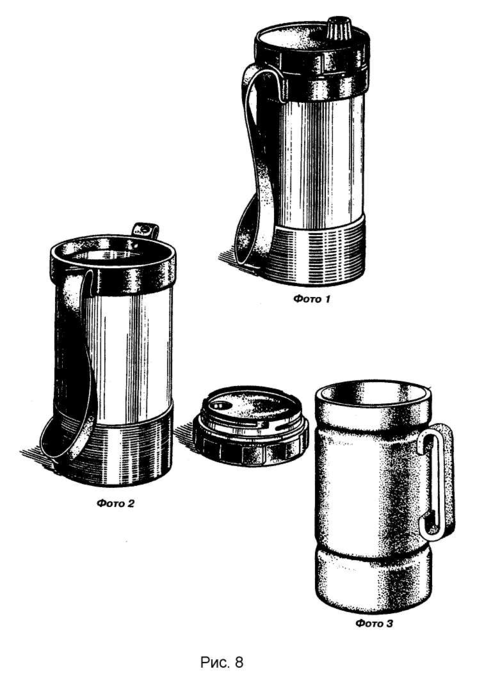 Термос состоит из пробки 1, крышки 2, уплотнения 3, горловины 4, быстросъемного пружинящего кольца 5, ремня 6, внутренней колбы 7, корпуса 8, основания 9, опоры внутренней колбы 10 (рис.9).