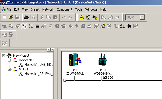 После вышеуказанных установок можно перейти к настройке режима обмена данными между ведущими и ведомыми составляющими системы. Для этого используем программу CX-Integrator. Настройки сохраняются в мастер модуле обмена CJ1W-DRM21, установленном в контроллере. Необходимо подключить контроллер CJ1M к ПК через последовательный порт и запустить CX-Integrator.