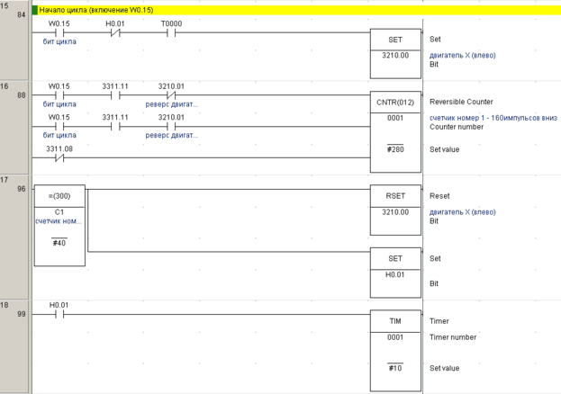 Если начальные условия выполнены, включить привод М1 (перемещения по оси Х влево). Одновременно с этим включается счетчик положения по оси Х (CNTR 0001), положительным считается направление «влево» (когда отключено реле реверса). Как только значение счетчика становится равным #40 (что равняется ___ импульсам), отключается двигатель М1, и включается переменная H0.01, которая в свою очередь включает таймер (TIM 0001), со значением #10, что равно ___ секундам.