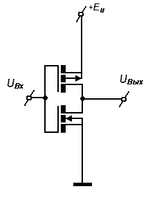 На схеме1 приведена схема КМОП-инвертора, являющаяся основной более сложных интегральных схем.