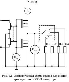 На рис. 6.1 показана схема электрическая лабораторного стенда предназначенного для исследования КМОП инвертора.