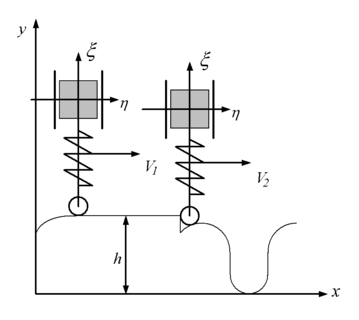 Дан неровный участок со сложным профилем. По нему движутся две идентичные системы, каждая из которых представляет собой подрессорный груз массой m = 0.7 кг, прикрепленный к безотрывно движущемуся с постоянной горизонтальной скоростью