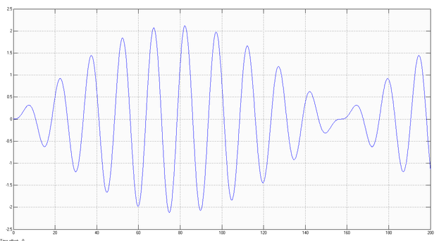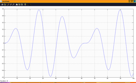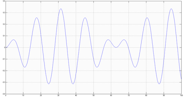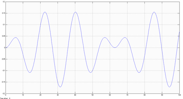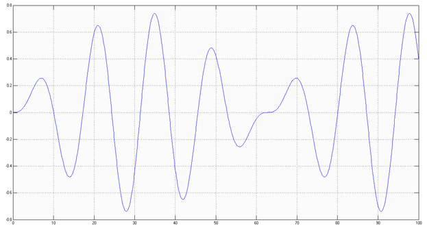 . Гармонические законы сменяют друг друга с периодом в 50 с. Время моделирования ограничим 100 секундами. Выберем k = 0.4 с