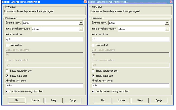Начальные условия интегрирования заданы в блоках интеграторов. Вид их приведен на рисунке 1.5.