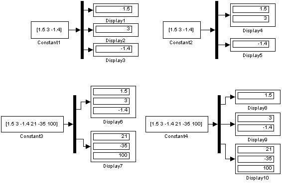 Если количество выходов P (значение параметра Number of Outputs) равно размерности входного сигнала N, то блок выполняет разделение входного вектора на отдельные элементы.