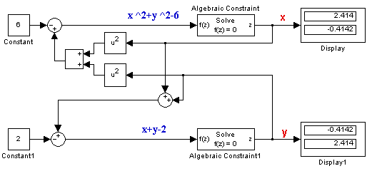 Поскольку данная система уравнений имеет два решения, то начальные значения блоков Algebraic Constraint заданы в виде векторов. Для первого (верхнего) блока начальное значение задано вектором [1 -1], а для второго (нижнего) блока – вектором [-1 1].