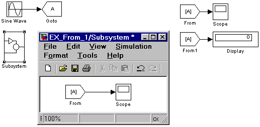 На рис. 9.7.12. показан пример использования блоков From в модели. В примере один блок Goto передает сигнал трем блокам From (двум в основной модели и одному в подсистеме).
