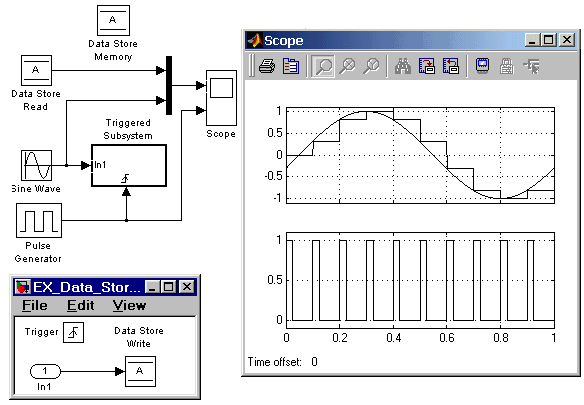 Пример использования блока Data Store Write совместно с блоками Data Store Memory и Data Store Read показан на рис. 9.7.14 (п.9.17.14).
