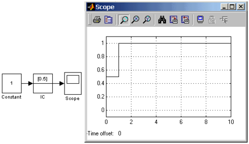 Пример использования блока IC показан на рис. 9.7.19. В примере начальное значение сигнала задано равным 0.5. Шаг расчета задан равным 1с.