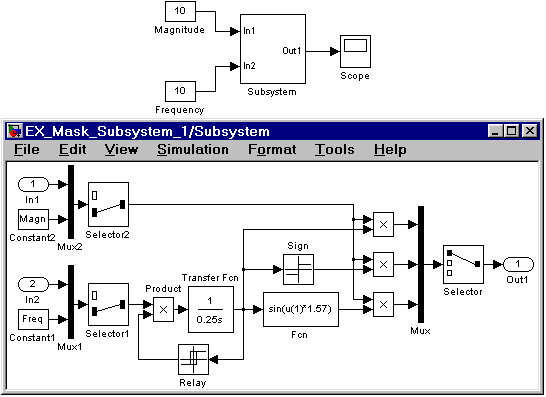 После того как маскирование системы будет выполнено, двойной щелчок на ее изображении будет открывать окно параметров подсистемы, а не окно модели. Открыть саму подсистему (окно модели) для редактирования или просмотра можно командой Look under mask из меню Edit или контекстного меню.