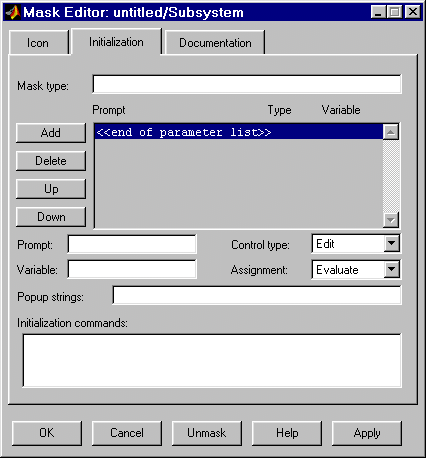 Указать идентификатор параметра в поле Variable (Переменная). Естественно, что это должен быть один из тех идентификаторов, который использовался при задании параметров блоков внутри подсистемы (хотя это не обязательно, поскольку параметр может быть использован и для модификации самого окна диалога). Все переменные, идентификаторы которых заданы на вкладке Initialization, помещаются в Mask Workspace – локальную рабочую область маски и являются доступными только внутри подсистемы.
