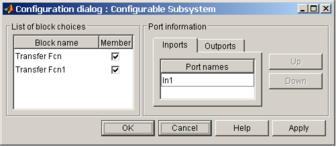 Открыть Configurable Subsystem и выполнить ее настройку, отметив флажками нужные варианты и выбрав отображаемые входные и выходные порты подсистемы. Пример окна диалога Configuration dialog показан на рис. 9.9.9.