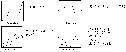 Примеры маскированных подсистем с различными вариантами графиков представлены на рис. 9.10.7. Значения переменных заданы на вкладке Initialization в графе Initialization commands.