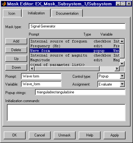 Окно редактора маски с открытой вкладкой Initialization, в котором создано окно параметров генератора, показано на рис. 9.10.4.