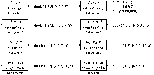 dpoly(num, den, 'z-') - Отображение дискретной дробно-рациональной передаточной функции от обратного аргумента.