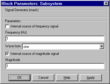 Выбор типа источников задания на частоту (внутренний или внешний) осуществляется с помощью блока Selector1 (см. рис. 9.10.2). Для этого значение параметра Elements блока Selector1 задано как [(Internal_freq+1)]. Таким образом, если флажок параметра Internal source of frequency signal установлен, то числовое значение переменной Internal_freq равно 1 и на выход селектора проходит сигнал от внутреннего источника, если же флажок снят, то на выход селектора проходит сигнал от входного порта системы (т.е. от внешнего по отношению к генератору источника). Аналогичным образом с помощью переменной Internal_magn выполняется выбор источника сигнала задания на амплитуду.