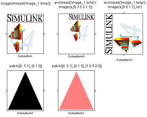 image(a, [x, y, w, h], rotation) – Команда аналогичная предыдущей, но позволяющая задавать поведение рисунка при вращении пиктограммы. Значение параметра rotation равное 'on' позволяет поворачивать рисунок вместе с пиктограммой подсистемы.