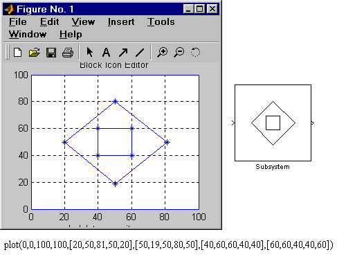 Пиктограмма создается по точкам, расположение которых указывается с помощью мыши. Между собой точки соединяются прямыми линиями. Для того, чтобы начать новую линию необходимо нажать клавишу n на клавиатуре. Для отмены создания последней точки используется клавиша d. Выход из редактора с автоматическим обновлением пиктограммы осуществляется клавишей q. По завершении работы с редактором необходимо также закрыть его окно рисования. Кроме обновления пиктограммы завершение работы с редактором пиктограмм сопровождается выводом в командной строке MATLAB графической команды, обеспечивающей построение пиктограммы.