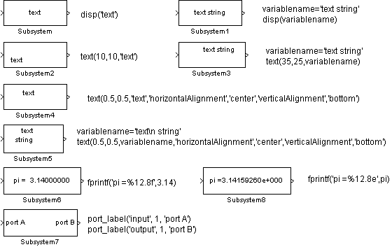 Примеры маскированных подсистем с различными вариантами текстовых надписей даны на рис. 9.10.6. Значения текстовых переменных заданы на вкладке Initialization в графе Initialization commands.