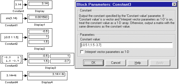 Значение константы может быть действительным или комплексным числом, вычисляемым выражением, вектором или матрицей.