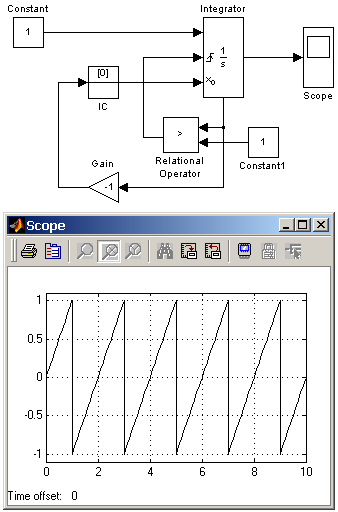 Пример на рис. 9.3.4 демонстрирует использование входного порта для сброса выходного сигнала и порта состояния интегратора с целью организации обратной связи. Схема работает следующим образом: входной постоянный сигнал преобразуется интегратором в линейно-изменяющийся, по достижении выходным сигналом значения равного 1 блок Relational Operator вырабатывает логический сигнал, по переднему фронту которого происходит сброс выходного сигнала интегратора до начального значения равного нулю. В результате на выходе интегратора формируется пилообразный сигнал, изменяющийся от 0 до +1.
