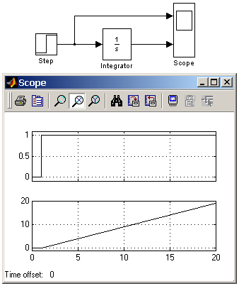 На рис. 9.3.2 показан пример работы интегратора при подаче на его вход ступенчатого сигнала. Начальное условие принято равным нулю.