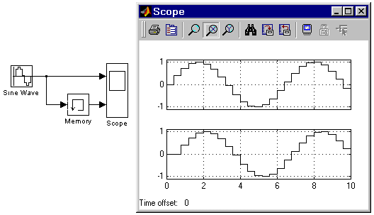 На рис. 9.3.6 показан пример использования блока Memory для задержки дискретного сигнала на один временной такт.